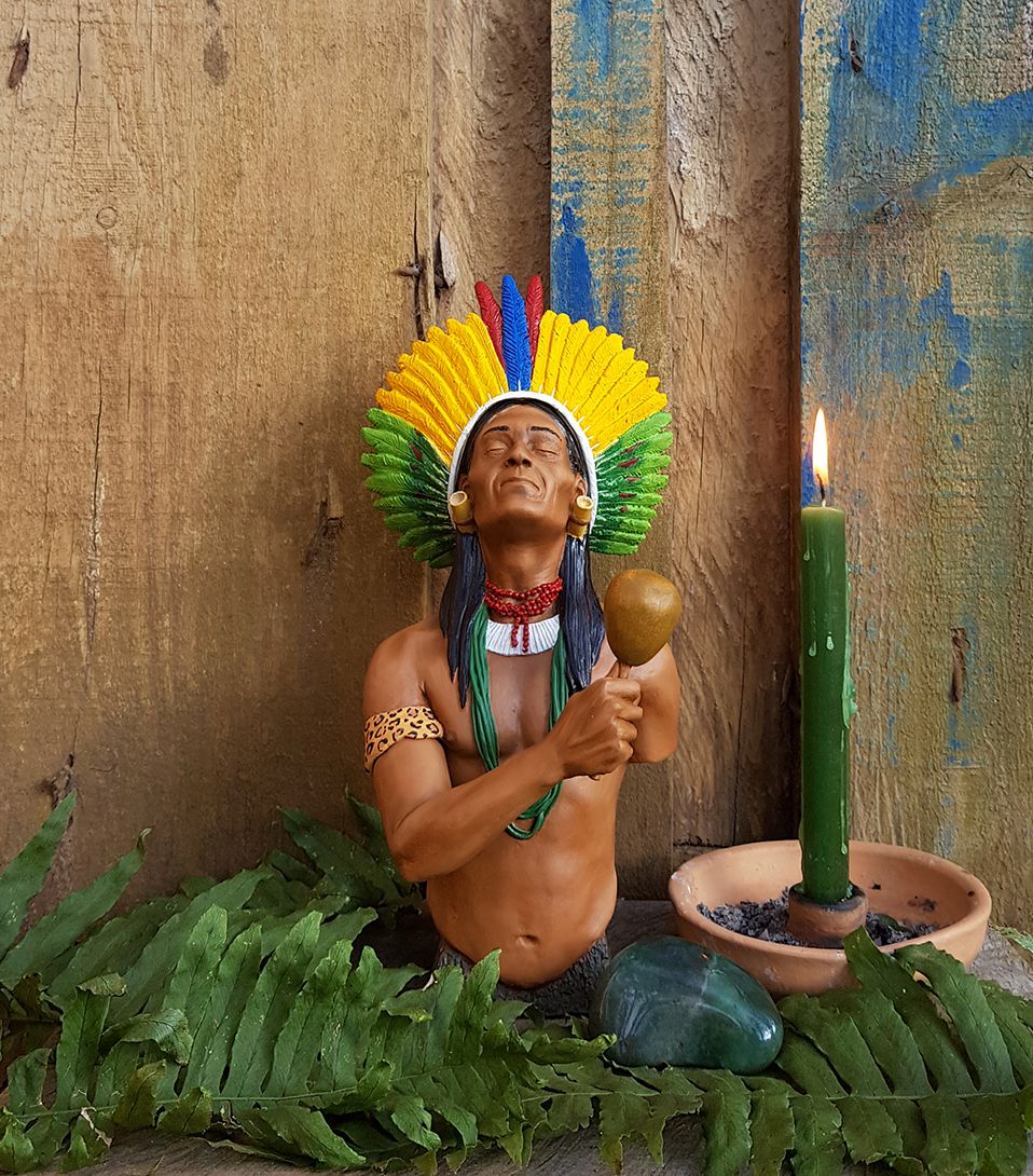 Foram muitas semanas de estudos sobre a anatomia dos povos originários brasileiros, especialmente de seus rostos. Existem mais de 200 etnias indígenas no Brasil, como Grarani, Ticuna, Ianomãmi, Xavante, Pataxó, Potiguara e Tupinambá, para citar alguns. É possível notar com facilidade as diferenças e particularidades anatômicas de cada etnia. Enquanto uns tem o rosto mais redondo, outros trazem um nariz mais largo ou as linhas dos olhos mais delicados, por exemplo. Procurei ser fiel não aos traços específicos de apenas um homem ou uma etnia, mas me aproximar o máximo possível de sua energia e, mais do que tudo, de seu posicionamento frente às adversidades da vida. Para tudo há uma cura e muitas vezes ela está dentro de nós, em profunda conexão com o sagrado.